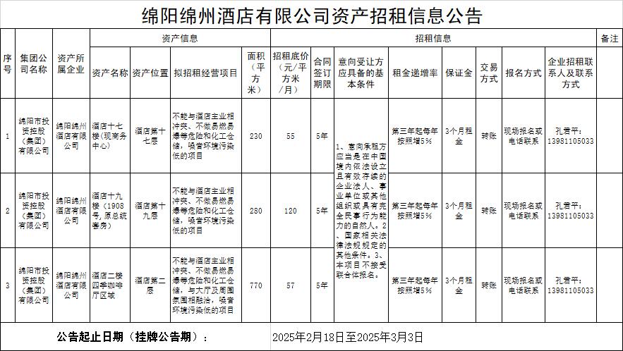 绵阳绵州酒店有限公司资产招租信息公告