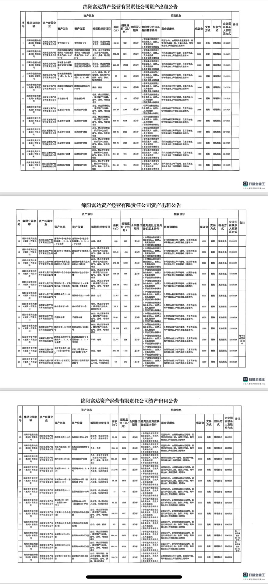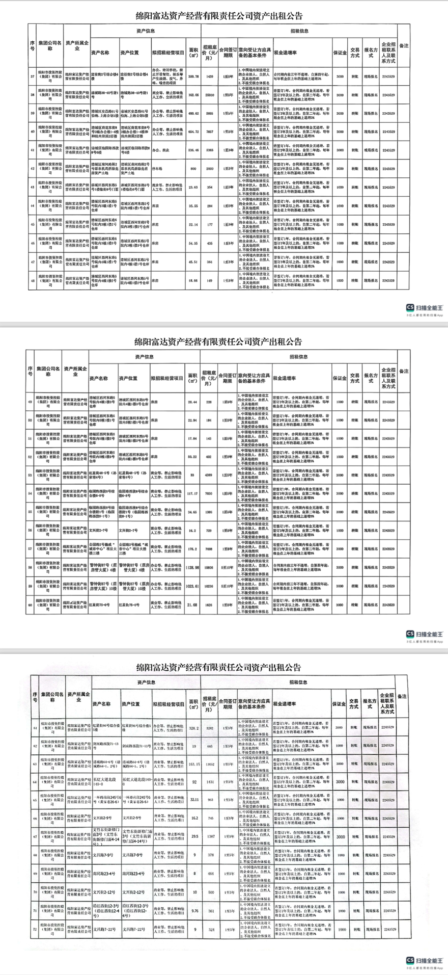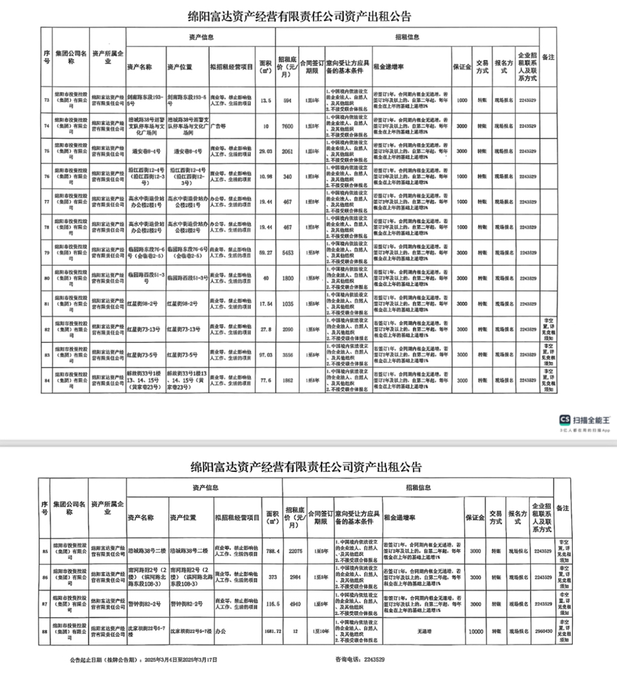 绵阳富达资产经营有限责任公司资产出租公告