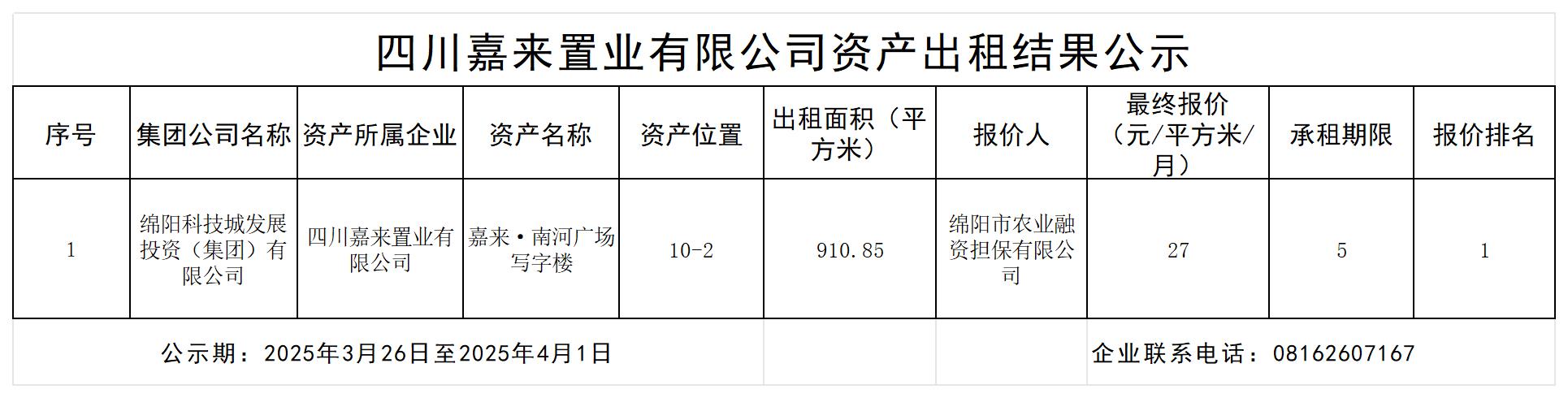 四川嘉来置业有限公司资产出租结果公示