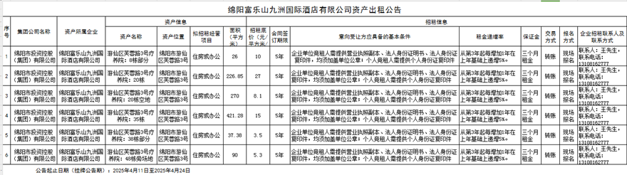 绵阳富乐山九洲国际酒店有限公司资产出租公告