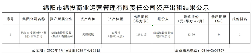 绵阳市绵投商业运营管理有限责任公司资产出租结果公示