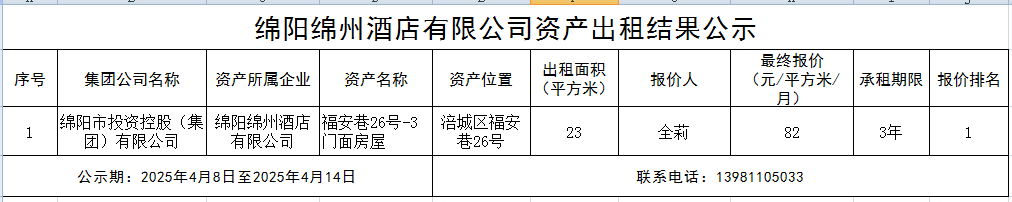 绵阳绵州酒店有限公司资产出租结果公示