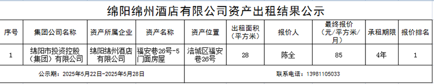 绵阳绵州酒店有限公司资产出租结果公示