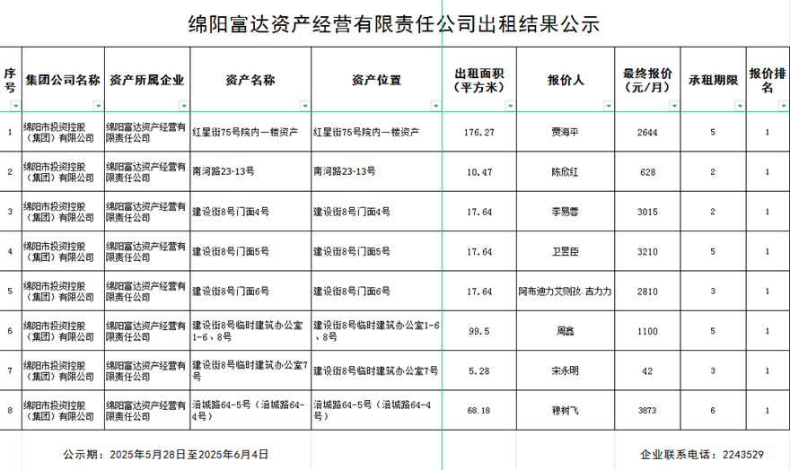 绵阳富达资产经营有限责任公司出租结果公示