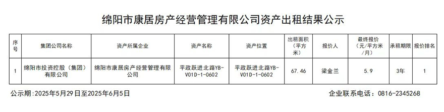 绵阳市康居房产经营管理有限公司资产出租结果公示