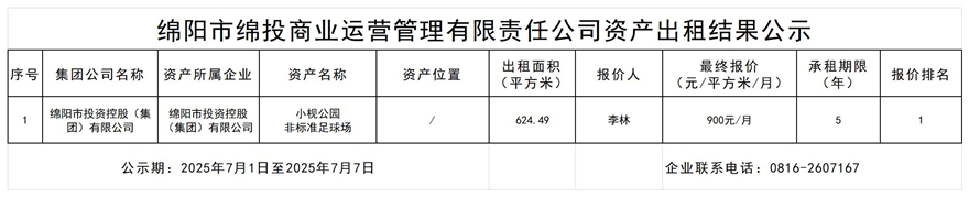 绵阳市绵投商业运营管理有限责任公司资产出租结果公示