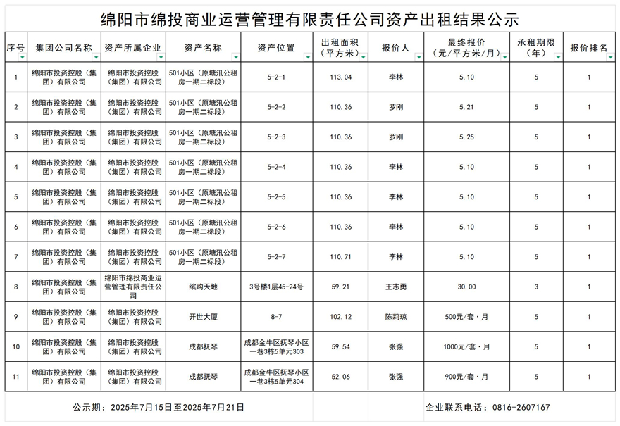 绵阳市绵投商业运营管理有限责任公司资产出租结果公示