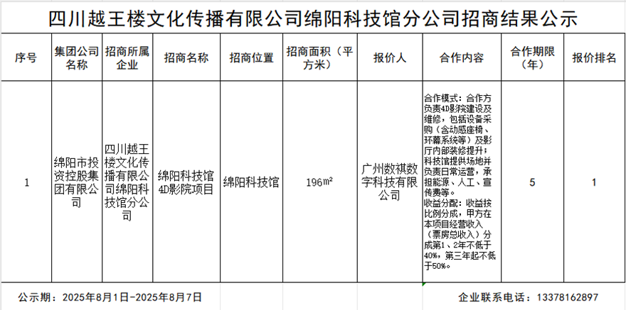 四川越王楼文化传播有限公司绵阳科技城分公司招商结果公示