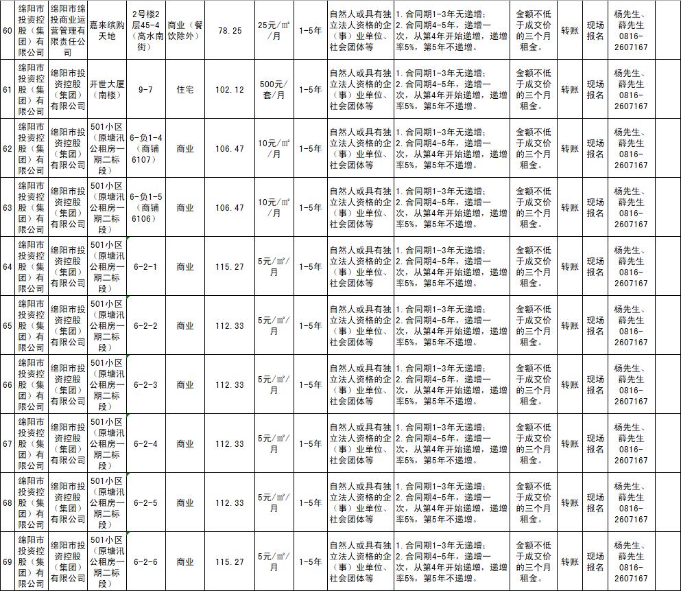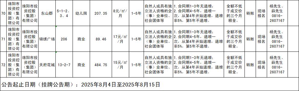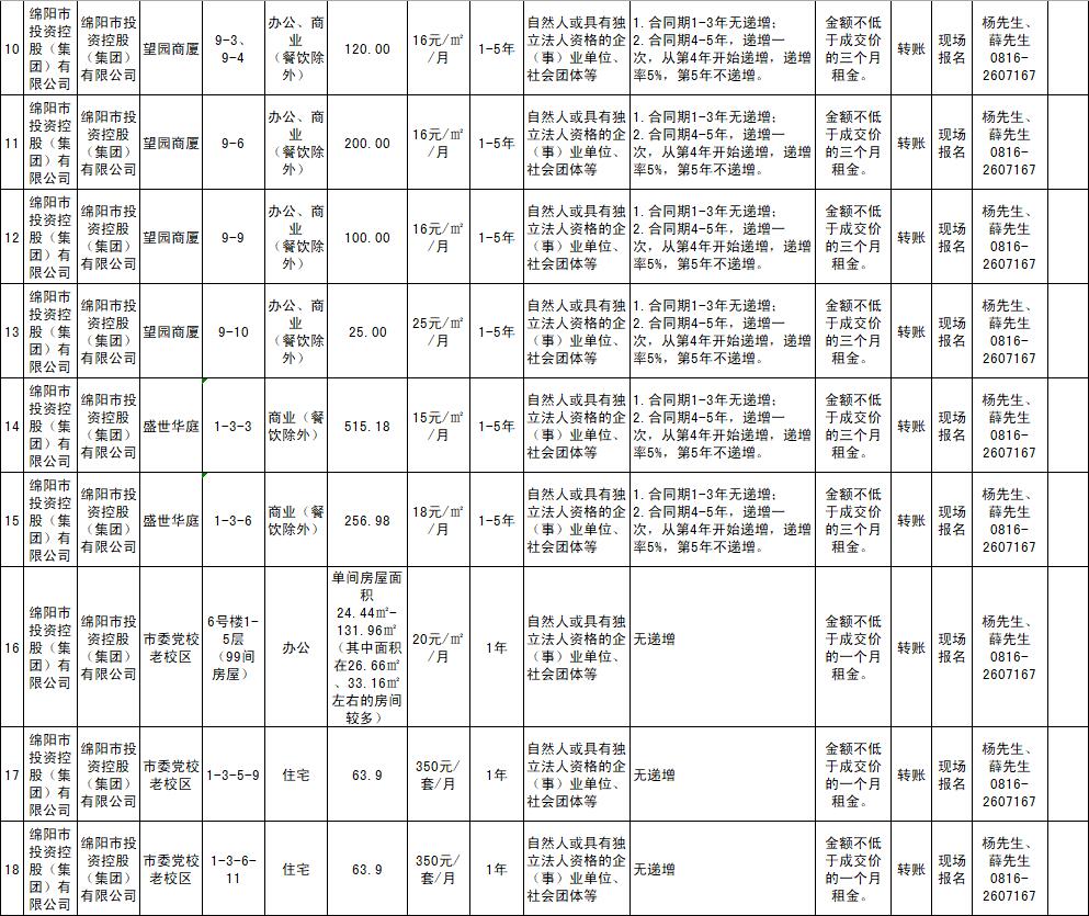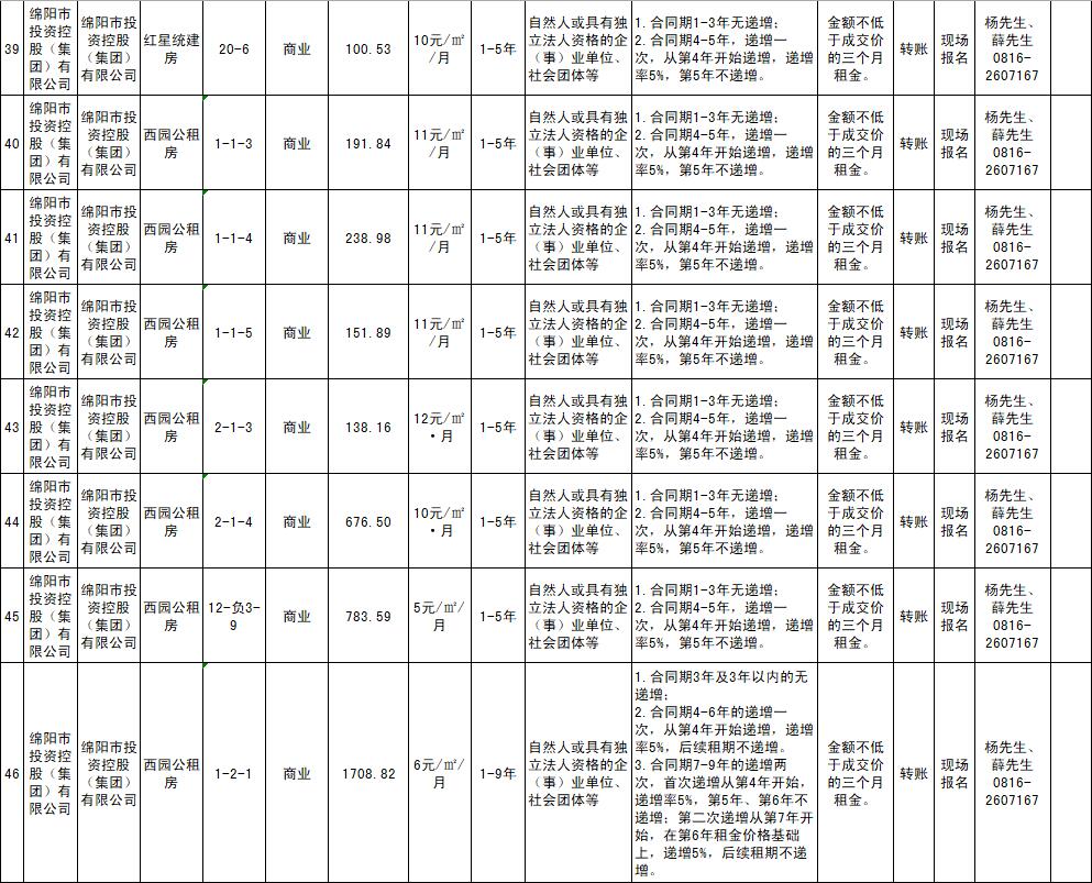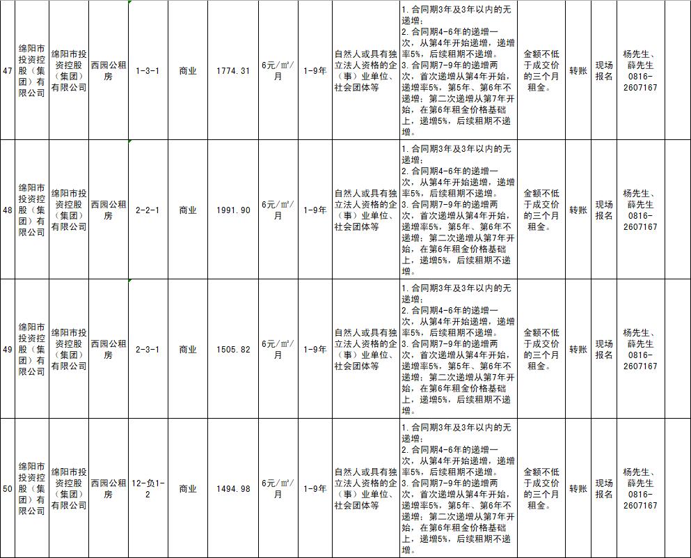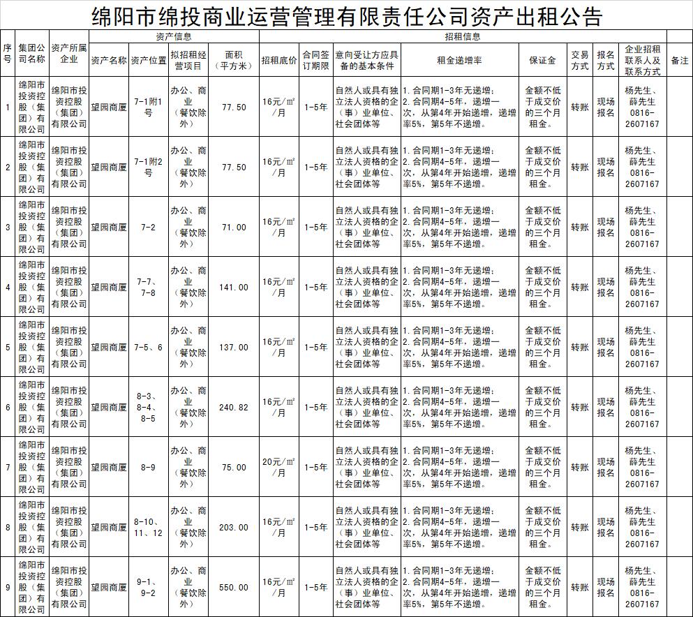 绵阳市绵投商业运营管理有限责任公司资产出租公告