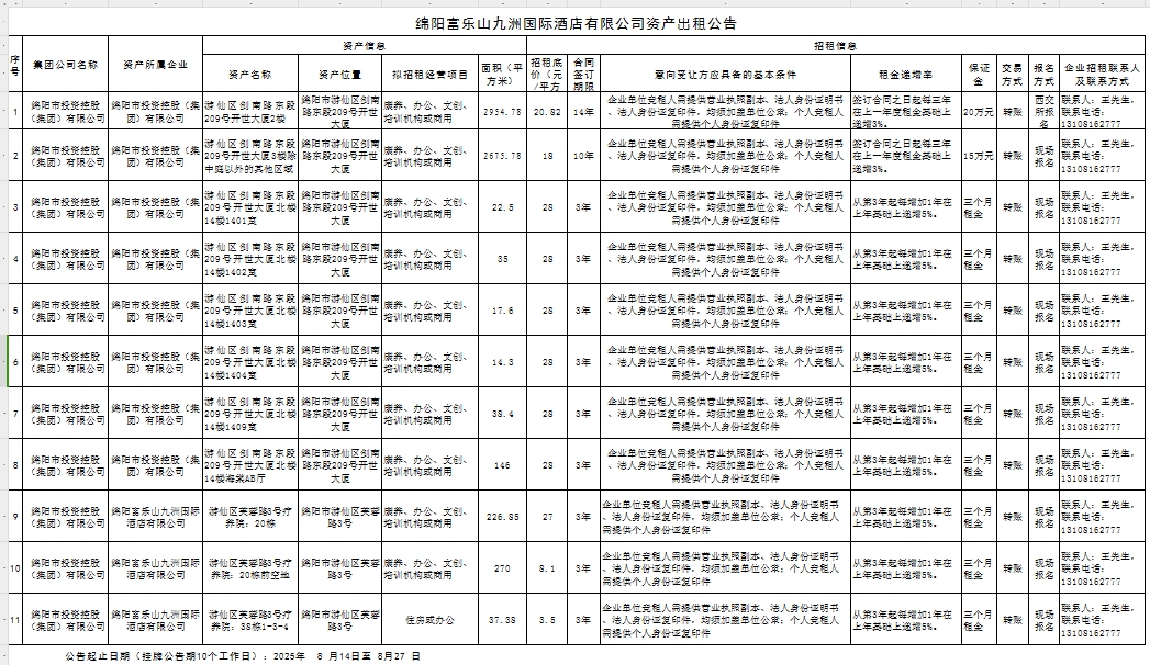 绵阳富乐山九洲国际酒店有限公司资产出租公告