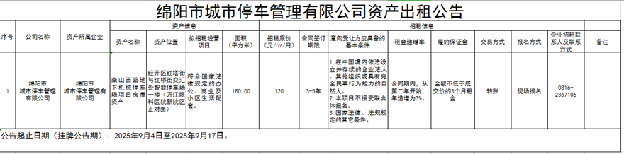 绵阳市城市停车管理有限公司资产出租公告
