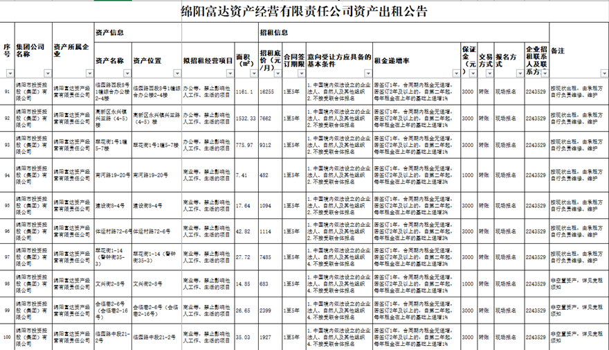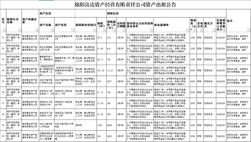 绵阳富达资产经营有限责任公司资产出租公告