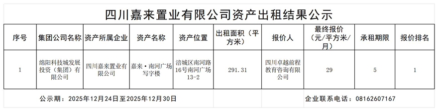 四川嘉来置业有限公司资产出租结果公示