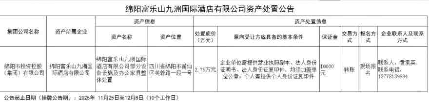 绵阳富乐山九洲国际酒店有限公司资产处置公告