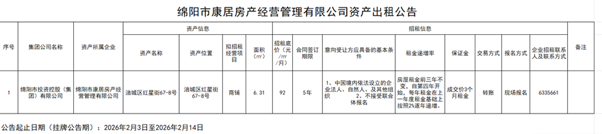 绵阳市康居房产经营管理有限公司资产出租公告