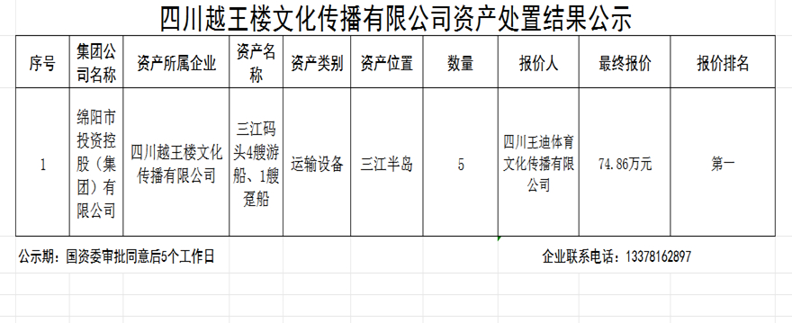 四川越王楼文化传播有限公司资产处置结果公示