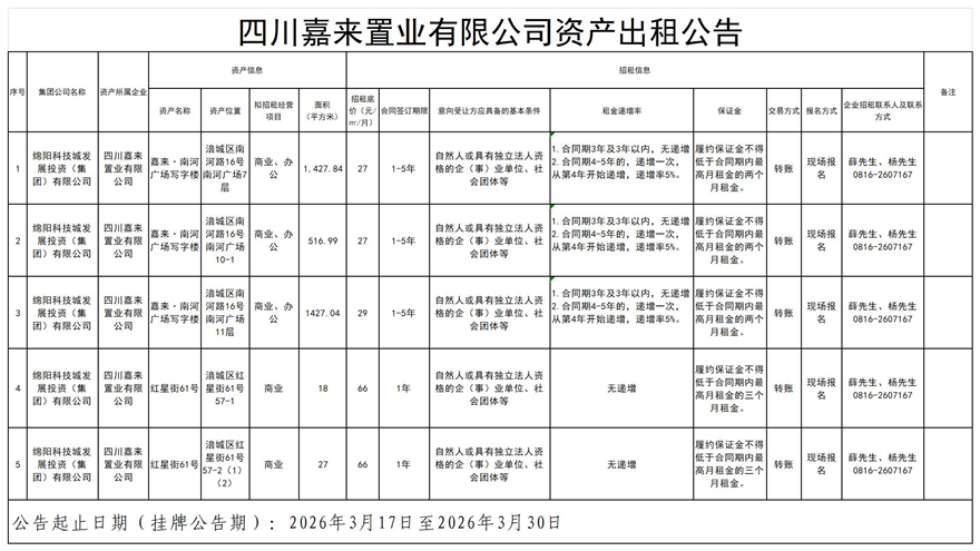四川嘉来置业有限公司资产出租公告