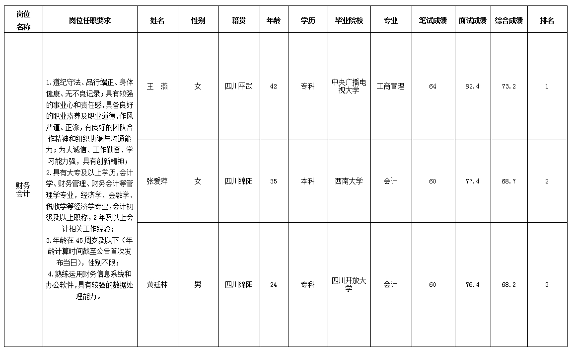 根据绵阳市绵州嘉来会务服务有限公司发布的招聘公告及招聘相关规定,经笔试、面试等程序,现将笔试(面试)成绩予以公示。