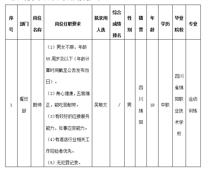 根据绵阳市东津酒店管理有限责任公司发布的招聘公告及招聘相关规定,通过面试等程序,拟录用吴敬文同志到餐饮部工作,现予以公示,具体情况如下: