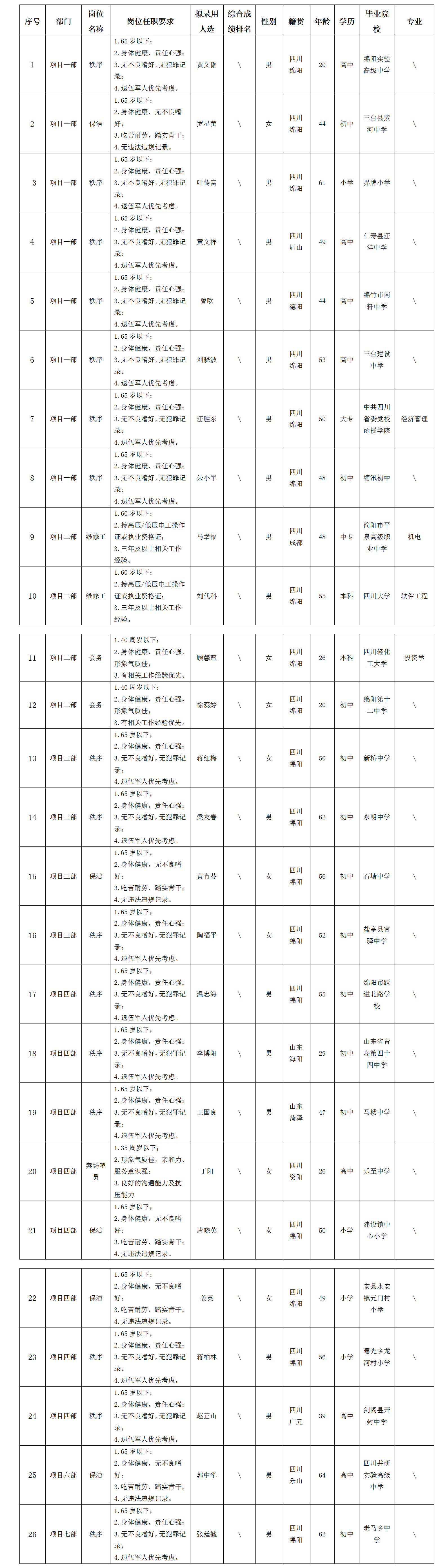 根据绵阳市康来物业服务有限公司发布的招聘公告及招聘相关规定,经面试等程序,拟录用贾文韬等同志到各项目部工作,现予以公示,具体情况如下: