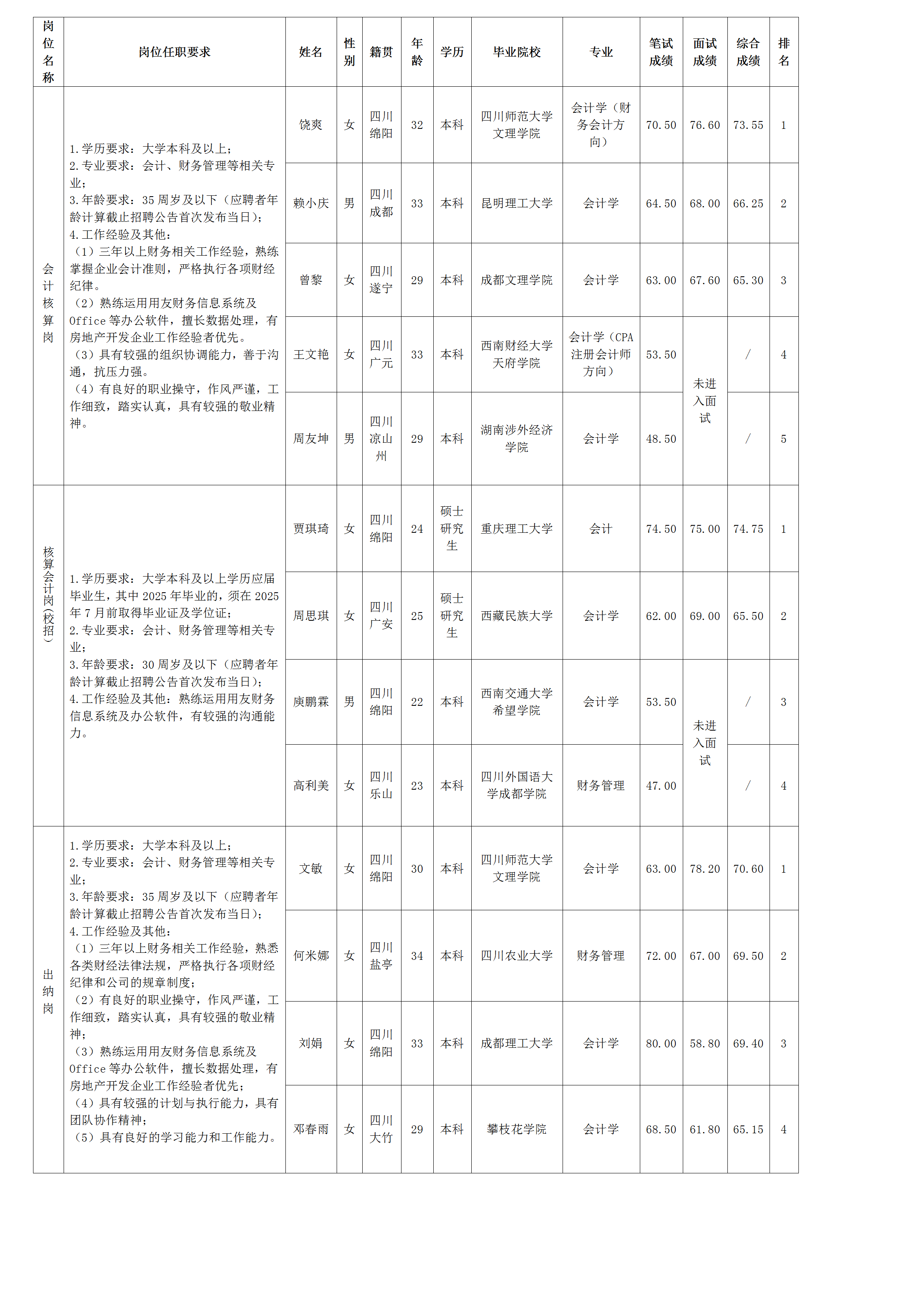 根据绵阳市绵投置地有限公司发布的招聘公告及招聘相关规定,经笔试、面试等程序,现将笔试、面试成绩予以公示。