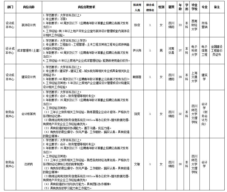 根据绵阳市绵投置地有限公司发布的招聘公告及招聘相关规定,经笔试、面试、考察、体检等程序,拟录用张俊等5名同志到绵阳市绵投置地有限公司工作,现予以公示,具体情况如下: