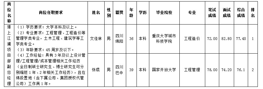 根据绵阳市绵投置地有限公司发布的招聘公告及招聘相关规定,经笔试、面试等程序,现将笔试、面试成绩予以公示。