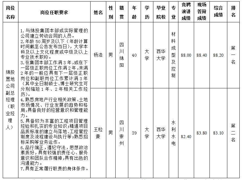 根据欧宝app《关于开展绵投置地公司经理层副职(职业经理人)内部选聘的公告》(绵投控司发〔2025〕119号)及招聘相关规定,经竞聘演讲、现场答辩等程序,现将竞聘成绩予以公示。