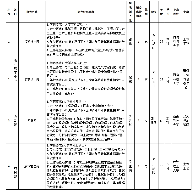 根据绵阳市绵投置地有限公司发布的招聘公告及招聘相关规定,经笔试、面试、考察、体检等程序,拟录用谢伟等4名同志到绵阳市绵投置地有限公司工作,现予以公示,具体情况如下: