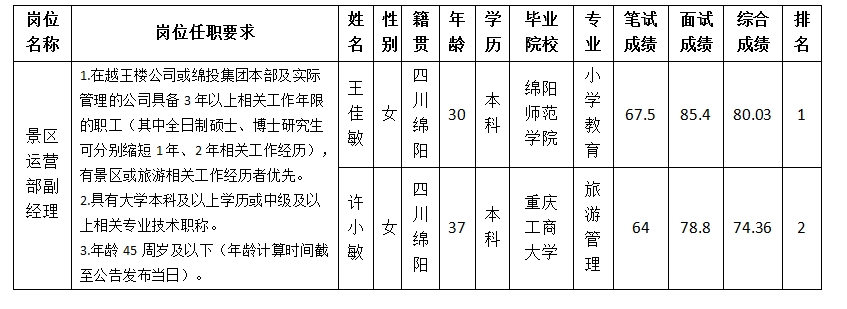 根据四川越王楼文化传播有限公司发布的招聘公告及招聘相关规定,经笔试、面试等程序,现将笔试(面试)成绩予以公示。