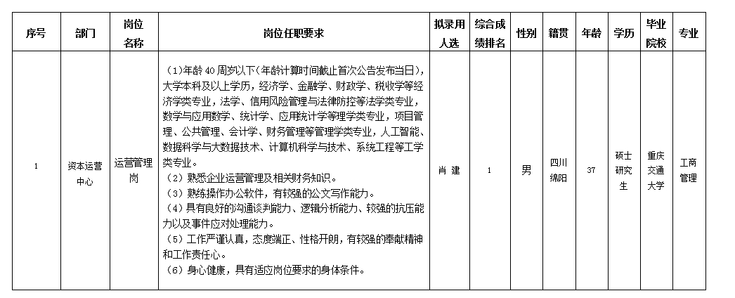 根据欧宝app发布的招聘公告及招聘相关规定,经笔试、面试、考察、体检等程序,拟录用肖建同志到欧宝app工作,现予以公示,具体情况如下: