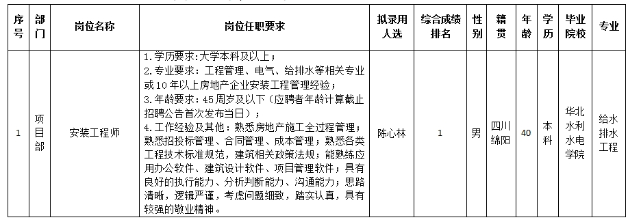 根据绵阳市绵投置地有限公司发布的招聘公告及招聘相关规定,经笔试、面试、考察、体检等程序,拟录用陈心林同志到绵阳市绵投置地有限公司工作,现予以公示,具体情况如下: