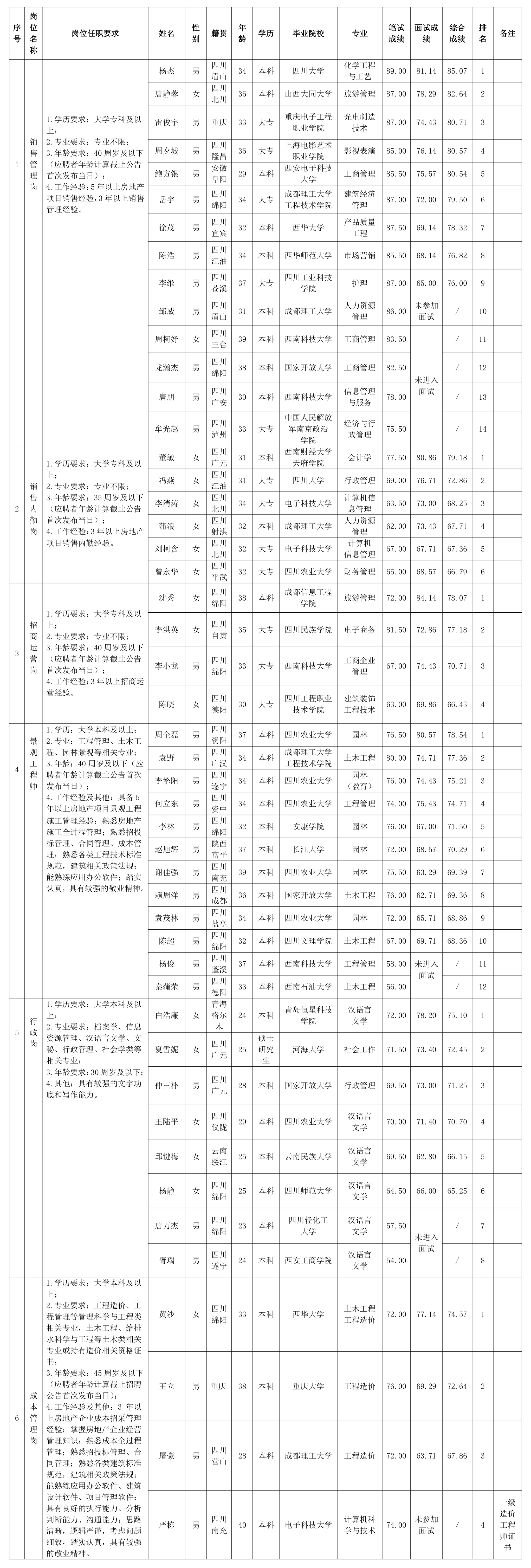 根据绵阳市绵投置地有限公司发布的招聘公告及招聘相关规定,经笔试、面试等程序,现将笔试、面试成绩予以公示。