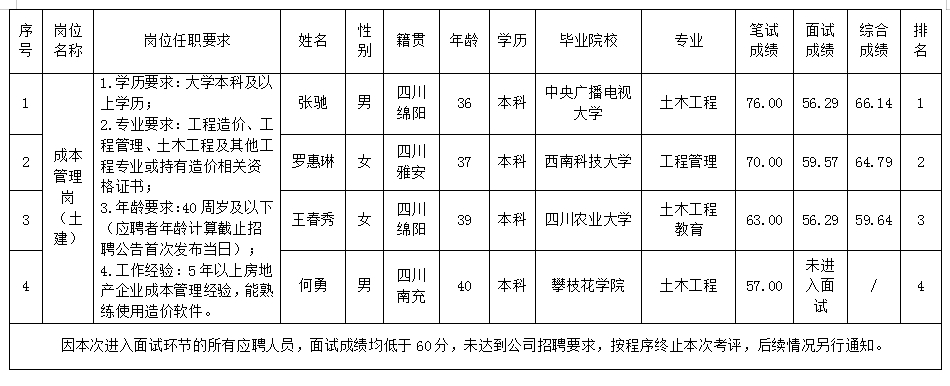 根据绵阳市绵投置地有限公司发布的招聘公告及招聘相关规定,经笔试、面试等程序,现将笔试、面试成绩予以公示。