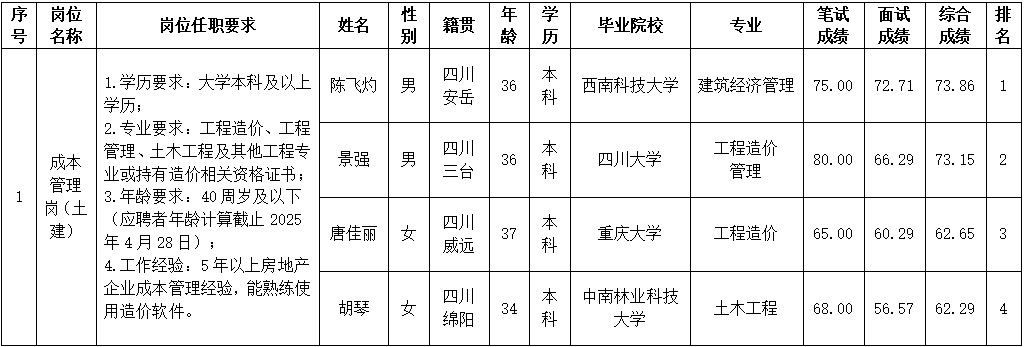 根据绵阳市绵投置地有限公司发布的招聘公告及招聘相关规定,经笔试、面试等程序,现将笔试、面试成绩予以公示。