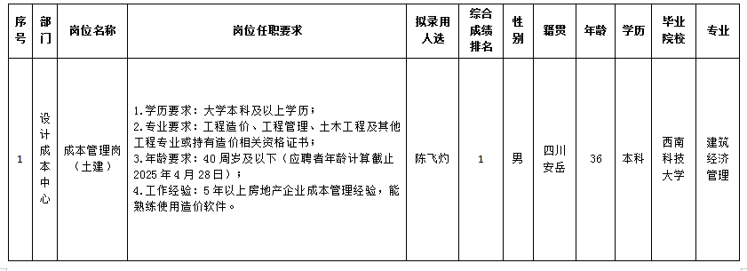 根据绵阳市绵投置地有限公司发布的招聘公告及招聘相关规定,经笔试、面试、考察、体检等程序,拟录用陈飞灼同志到绵阳市绵投置地有限公司工作,现予以公示,具体情况如下: