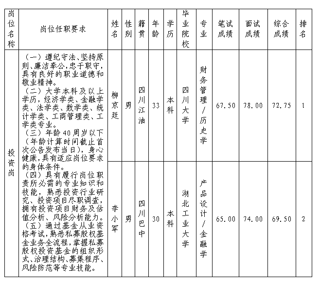 根据绵阳绵投私募基金管理有限公司发布的招聘公告及招聘相关规定,经笔试、面试等程序,现将内部选聘成绩予以公示。