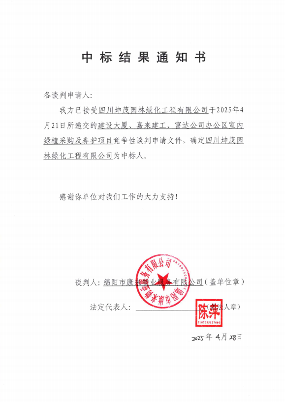 建设大厦、嘉来建工、富达公司办公区室内绿植采购及养护项目中标结果通知