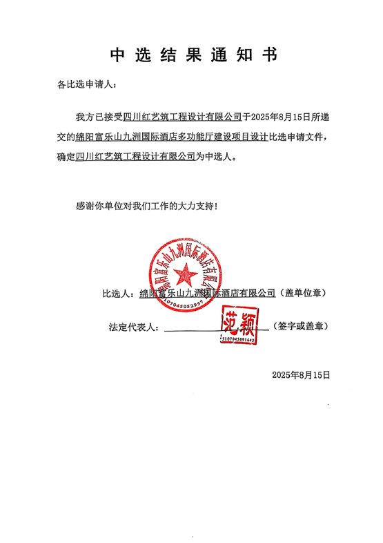 绵阳富乐山九洲国际酒店多功能厅建设项目设计中选结果通知
