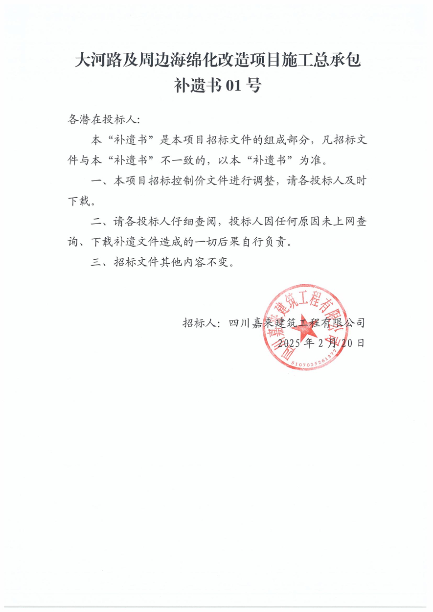 大河路及周边海绵化改造项目施工总承包补遗书01号