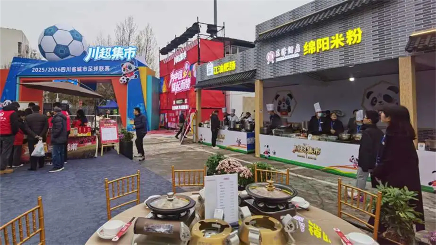 3月14日上午,作为2025/2026四川省城市足球联赛第二阶段(决赛阶段)重要配套服务,川超集市在南河体育中心火热开市。东津酒店作为绵阳本地特色餐饮品牌代表受邀精彩亮相,为赛事增添了一抹独特的“烟火气”。
